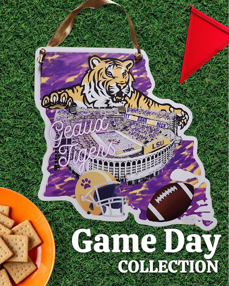 Bold, vibrant designs that celebrate Louisiana spirit — from the LSU Tigers and Saints to the laid-back Gulf Coast vibe of the blue crab “Welcome” sign.