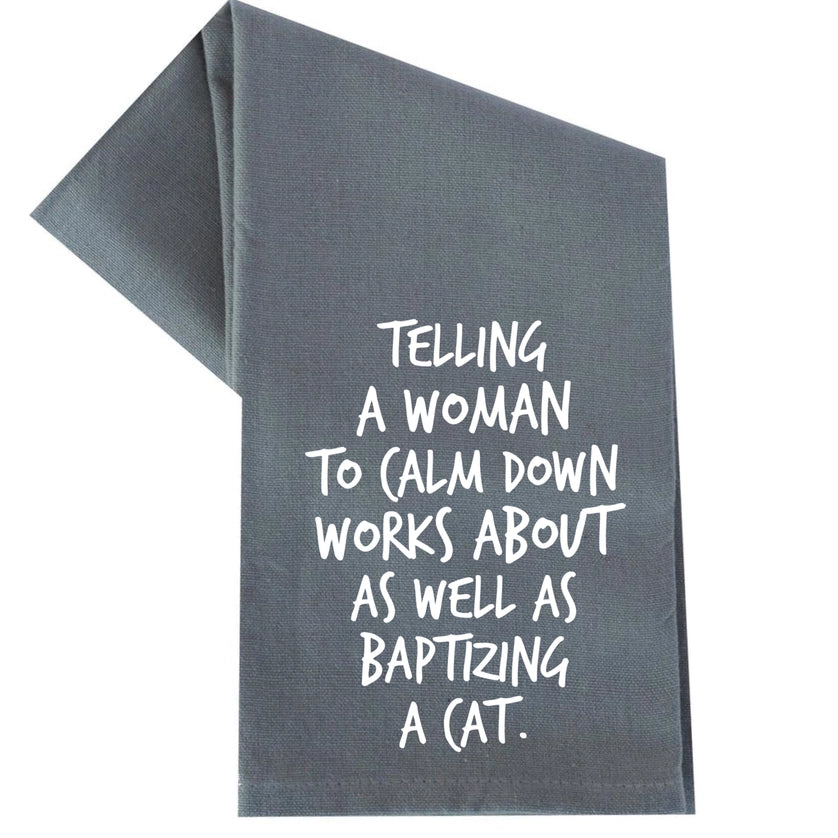 Add a dash of sass to your kitchen with this funny cotton tea towel — because telling a woman to calm down works about as well as baptizing a cat! 🐱