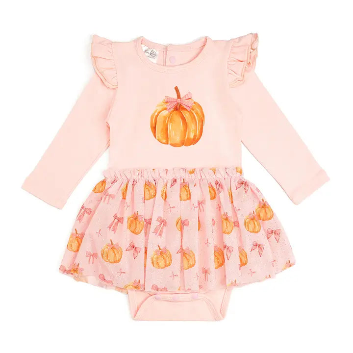 The Coquette Pumpkin Long Sleeve Tutu Bodysuit is a fun and festive bodysuit for babies celebrating Fall!