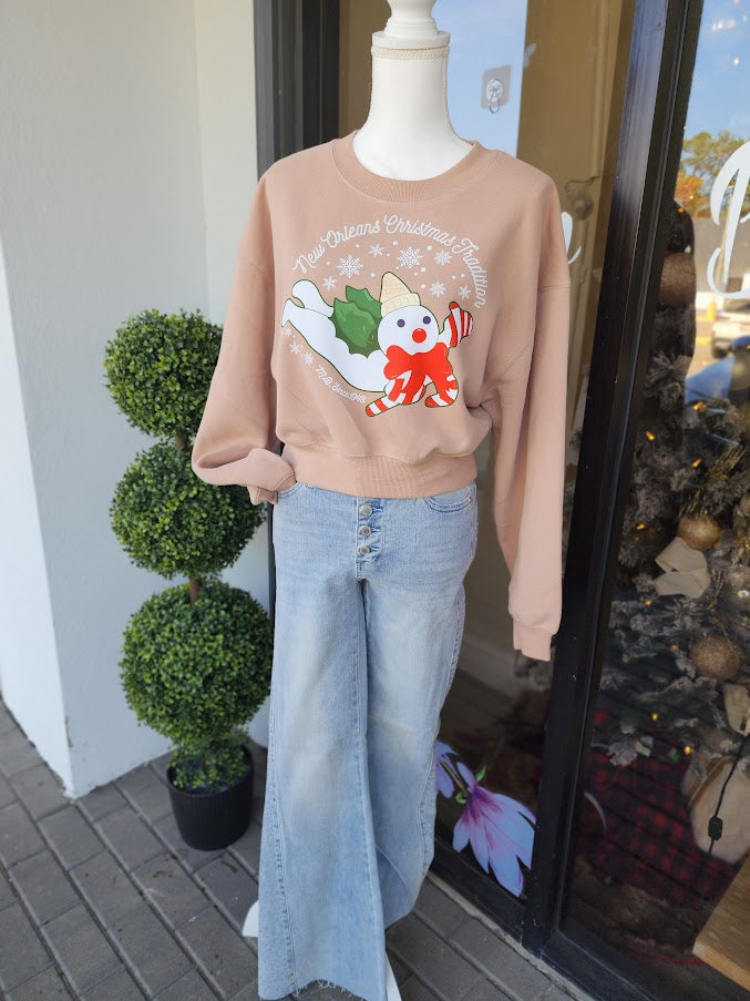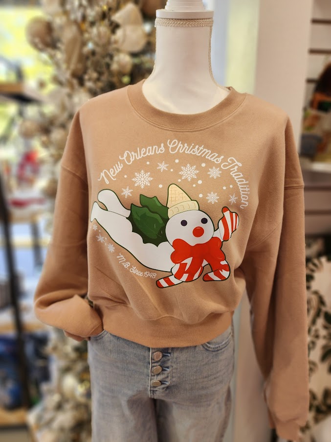 Mr. Bingle “New Orleans Christmas Tradition” Sweatshirt – Holiday Heritage Collection Looking for a festive holiday sweatshirt that celebrates true New Orleans nostalgia? This Mr. Bingle sweatshirt brings cozy comfort and classic Crescent City Christmas tradition together in one timeless piece. Featuring the beloved Mr. Bingle character—introduced in 1948 and cherished for generations—this sweatshirt adds a warm, local touch to your holiday wardrobe. Soft, comfortable, and easy to style, it’s the perfect way to show your NOLA pride all season long. Why You’ll Love It Classic Mr. Bingle artwork that celebrates a storied New Orleans holiday tradition Soft, cozy fabric ideal for crisp winter days, holiday events, and lounging Warm caramel-beige color that pairs effortlessly with jeans, leggings, and seasonal layers Relaxed crewneck fit for easy, comfortable everyday wear A meaningful local design, perfect for gifting to anyone who loves New Orleans history Perfect For… Holiday markets and Christmas festivals Family photos with a New Orleans twist Weekend outings in the Quarter or City Park Cozy movie nights and Christmas decorating Gifting to locals, transplants, or NOLA enthusiasts Fit & Sizing Relaxed, unisex-style fit. True to size for a slightly roomy, comfortable feel Size up for an oversized look (If you’d like to add a full size chart, just send it over.) Materials Fabric details not listed, but designed to feel soft, warm, and comfortable for everyday wear.