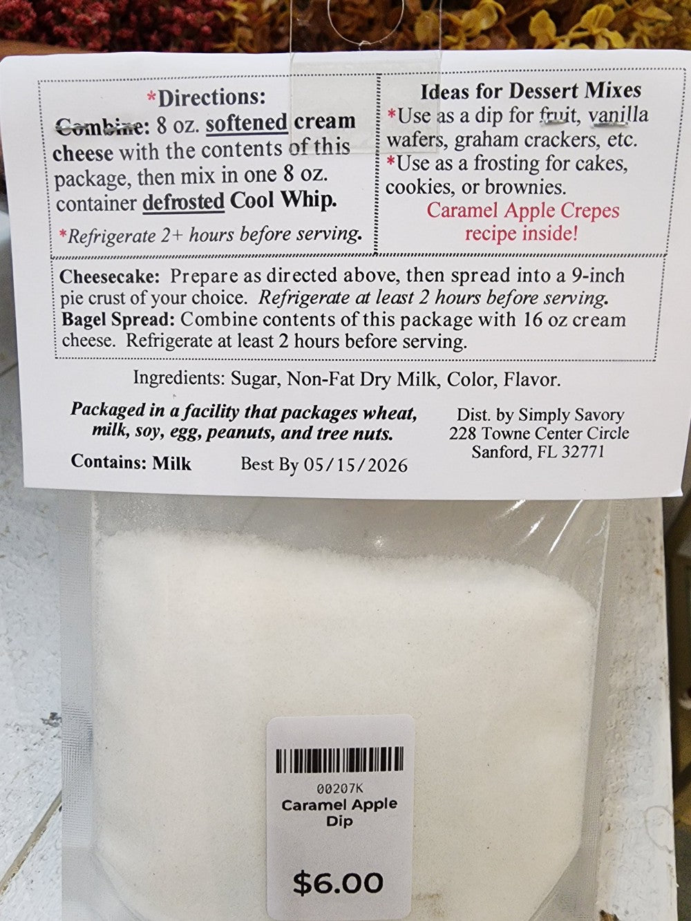 Simply Savory Caramel Apple Dessert Dip Mix brings back memories of the county fair and fall festivals, without the sticky mess. Includes a recipe for caramel apple crepes!