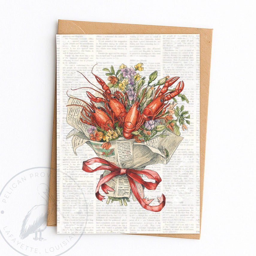 Featuring original in-house artwork designed exclusively for Pelican Provision Co., this card showcases a beautifully illustrated bouquet of vibrant red crawfish wrapped in vintage newsprint and tied with a ribbon — a creative twist on traditional florals.